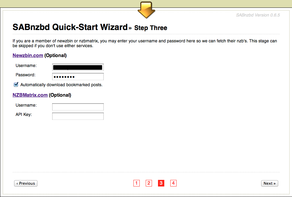 Klik vervolgens de “Next” knop, waardoor we aankomen bij de instellingen pagina voor NZB aanbieders zoals Newzbin.com en NZBMatrix.com – beiden zijn optioneel maar minstens een van deze twee is aan te raden. Beiden diensten bieden NZB informatie als een RSS feed aan welke door SABnzbd gelezen kan worden.